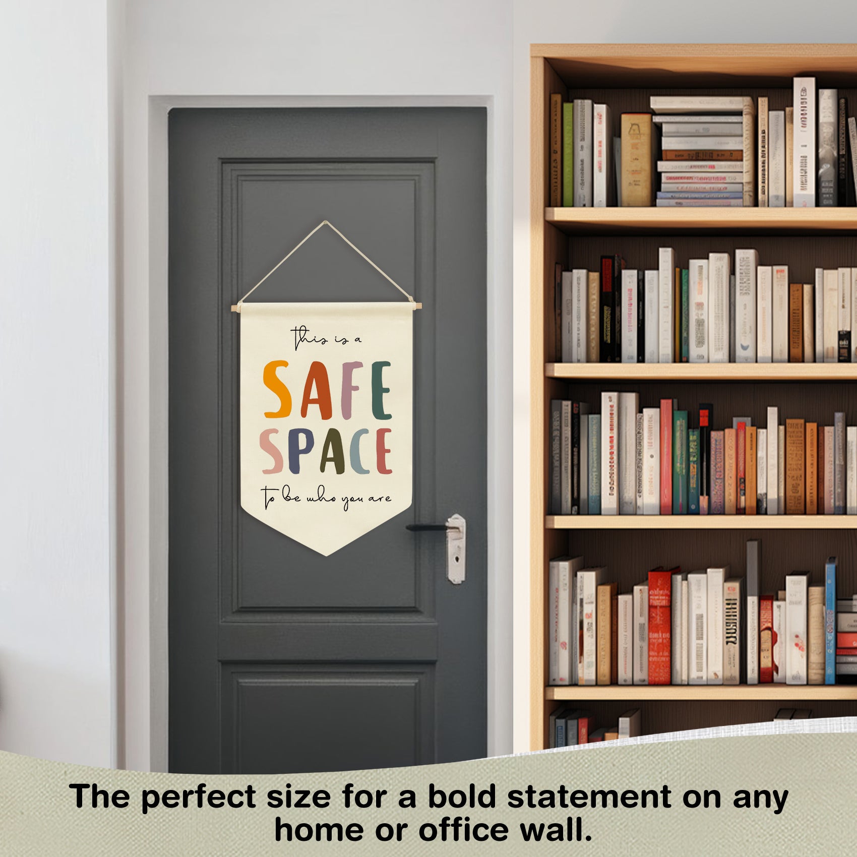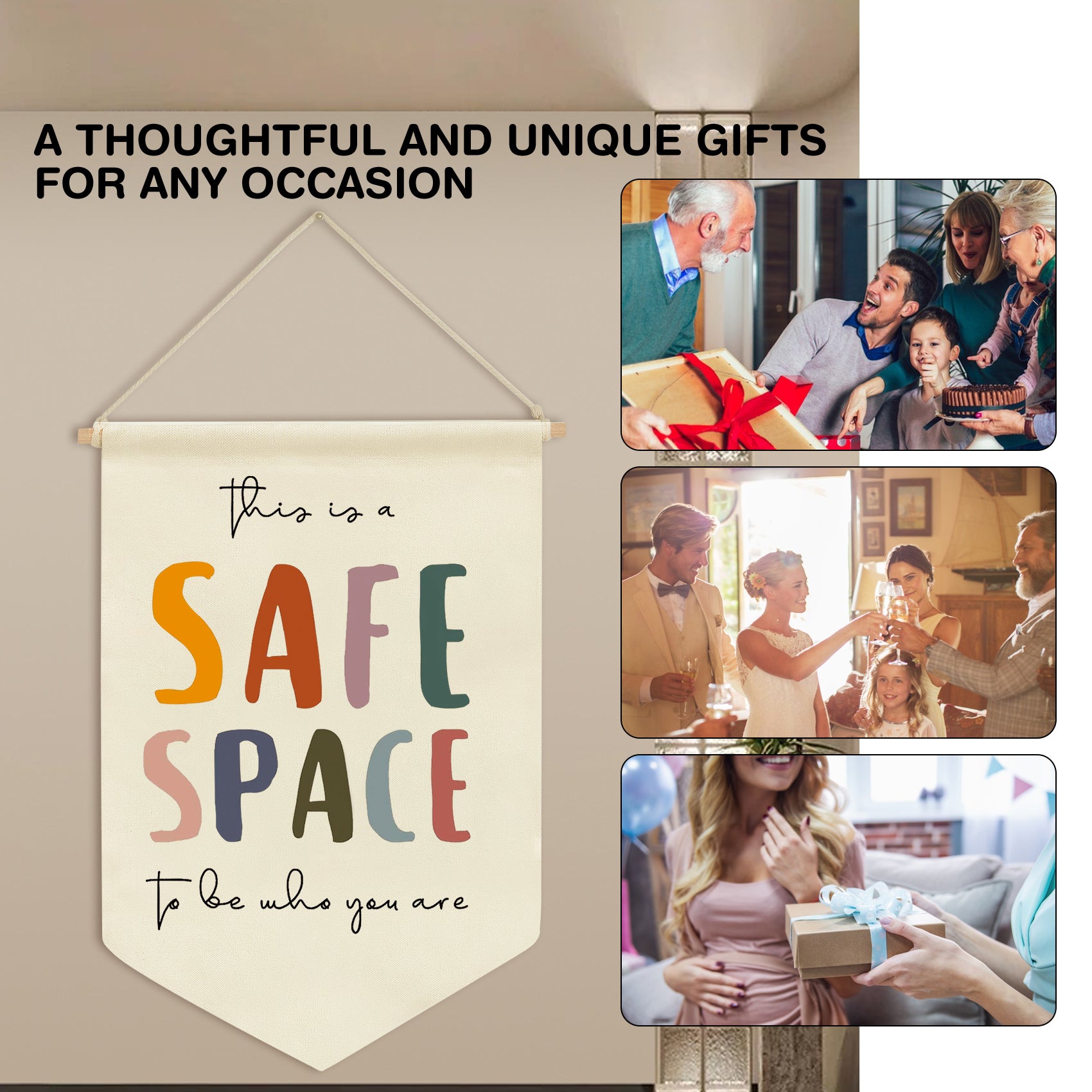 - Superior Material: The banners is crafted from thick, durable, original-color canvas, with excellent craftsmanship. The safe space sign comes equipped with cotton thread and wooden sticks, featuring grooves at the binding points for easy installation and hanging. This safe space wall hanging is especially favored by school psychologists