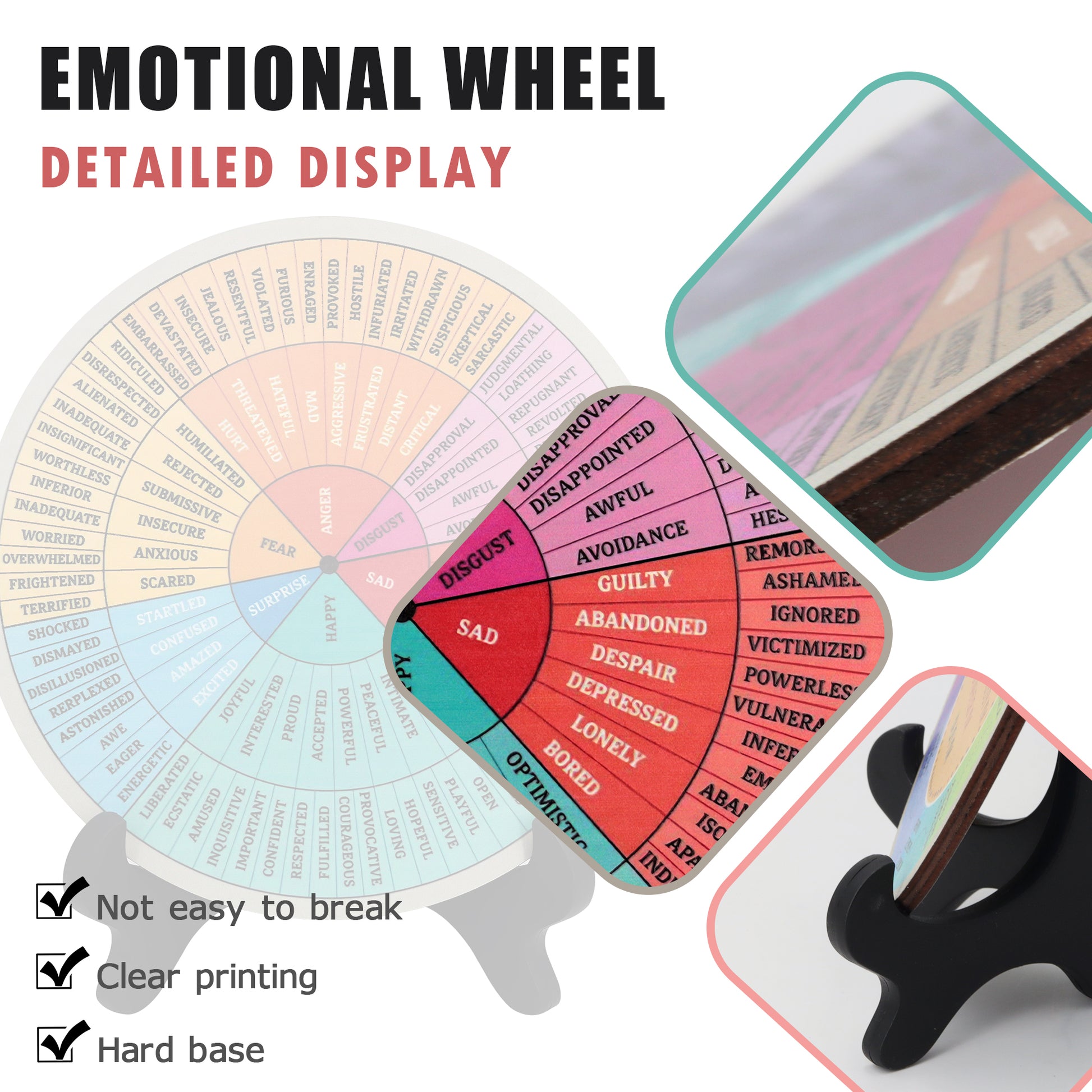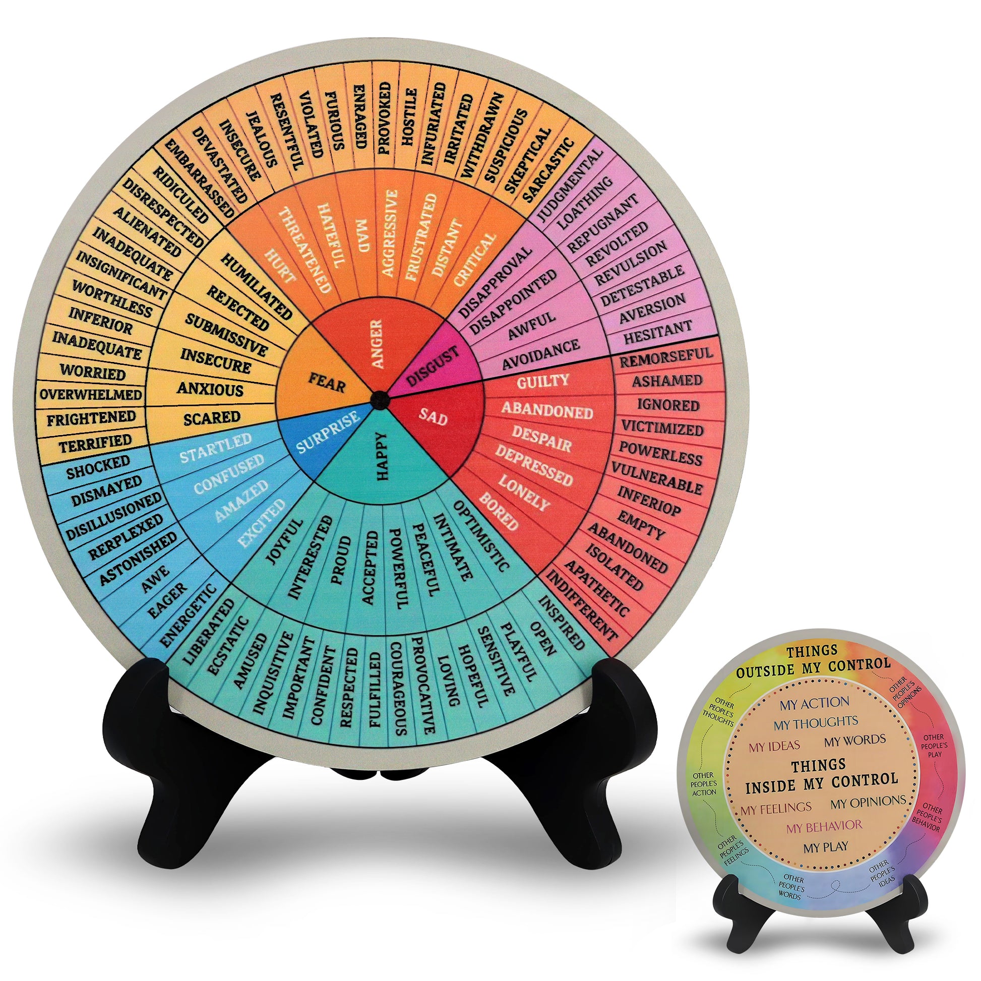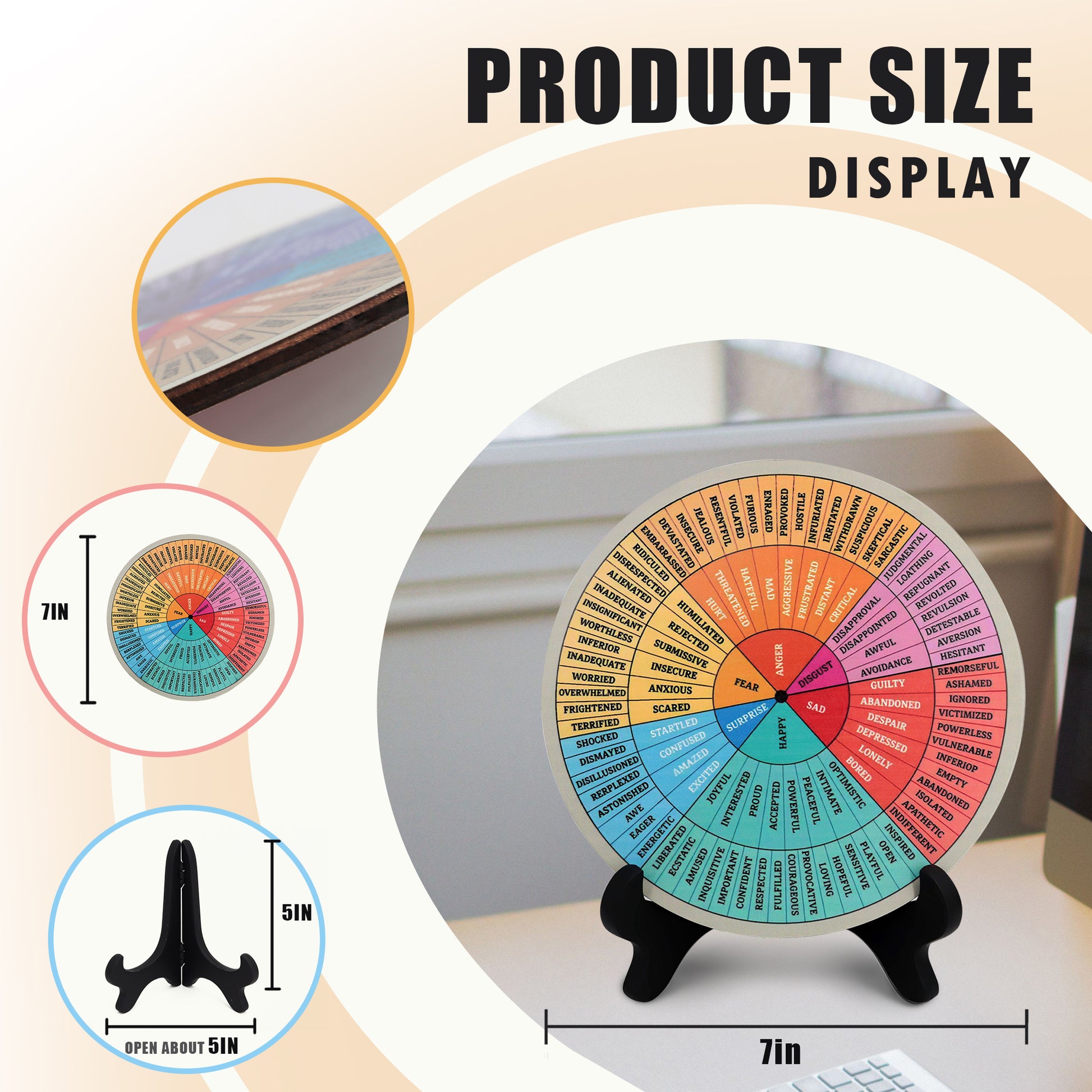 - Size & Material: Ainrvteers emotions wheel is made of high-quality wood. The emotions wheel is about7 inches in diameter and the plastic base is about 5 inches high. The soft and soothing colors make it a great tool to help reduce stress and regulate emotions.